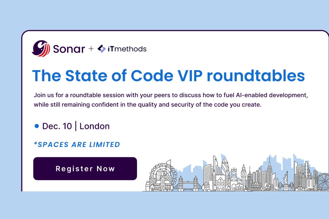 This AI engineering productivity paradox—increasing coding speed not directly relating to improved development velocity—is the subject of Sonar’s upcoming roundtables in NYC & London. Join us and discuss with your peers how to fuel AI-enabled development, while still remaining confident in the quality of the code you create.